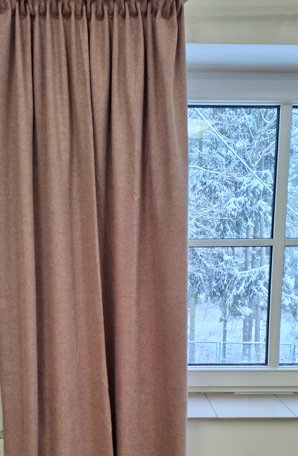 Zasłony uszyte na taśmie marszczącej 5 cm. Tkanina miękka, lejąca o strukturze lnu. Poziom zaciemnienia 80%